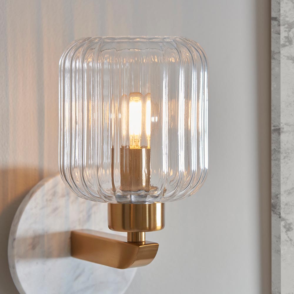 Bring refined elegance to your interior with this striking wall light, where contemporary design meets timeless materials. A solid white Volakas marble backplate provides a luxurious foundation for the sleek warm brass arm, which supports a minimalist clear ribbed glass shade that reveals the warm glow of the bulb inside. Ideal for hallways, living spaces, or bedside settings, this wall light offers a soft ambient glow while adding a sculptural touch to your decor.