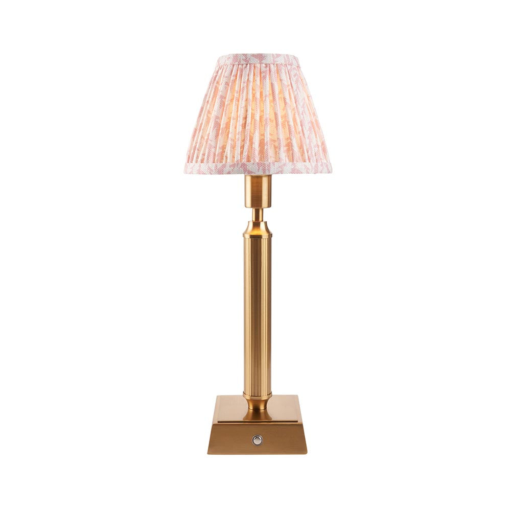 Not tied down by the need for a power cable, this portable, rechargeable 3 stage touch dimmer table lamp enables you to select your own level of light. Classic in style with a reeded stem and square base, finished in aged brass making it easy to place around your home. Turns on for low light then touch controlled to increase light level to medium then bright. Taking just 5.5 hours to fully charge and giving up to 36 hours of continuous light. Place on shelving, hallways, bedsides or dining tables, a truly versatile addition to your home. Paired with our subtle peachy keen 16cm Leaf decorative clip-on shade for the perfect timeless style.