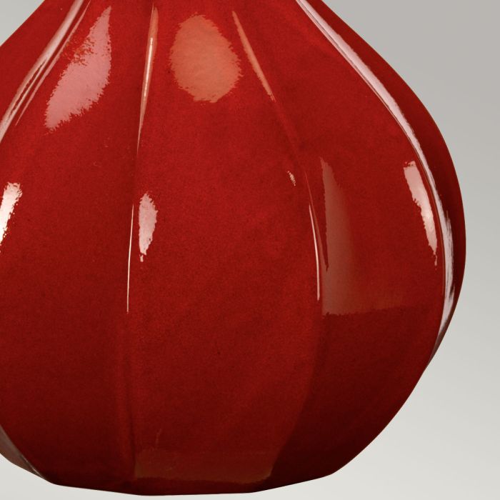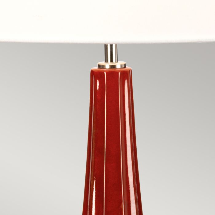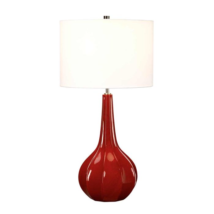 RETIRING COLLECTION MODEL - CHECK STOCK AVAILABILITY. Upton is a vibrant Red glaze on a gourd shaped ceramic vase. This portable is completed with a White faux linen cylinder shade and Polished Nickel finial. Made in England.