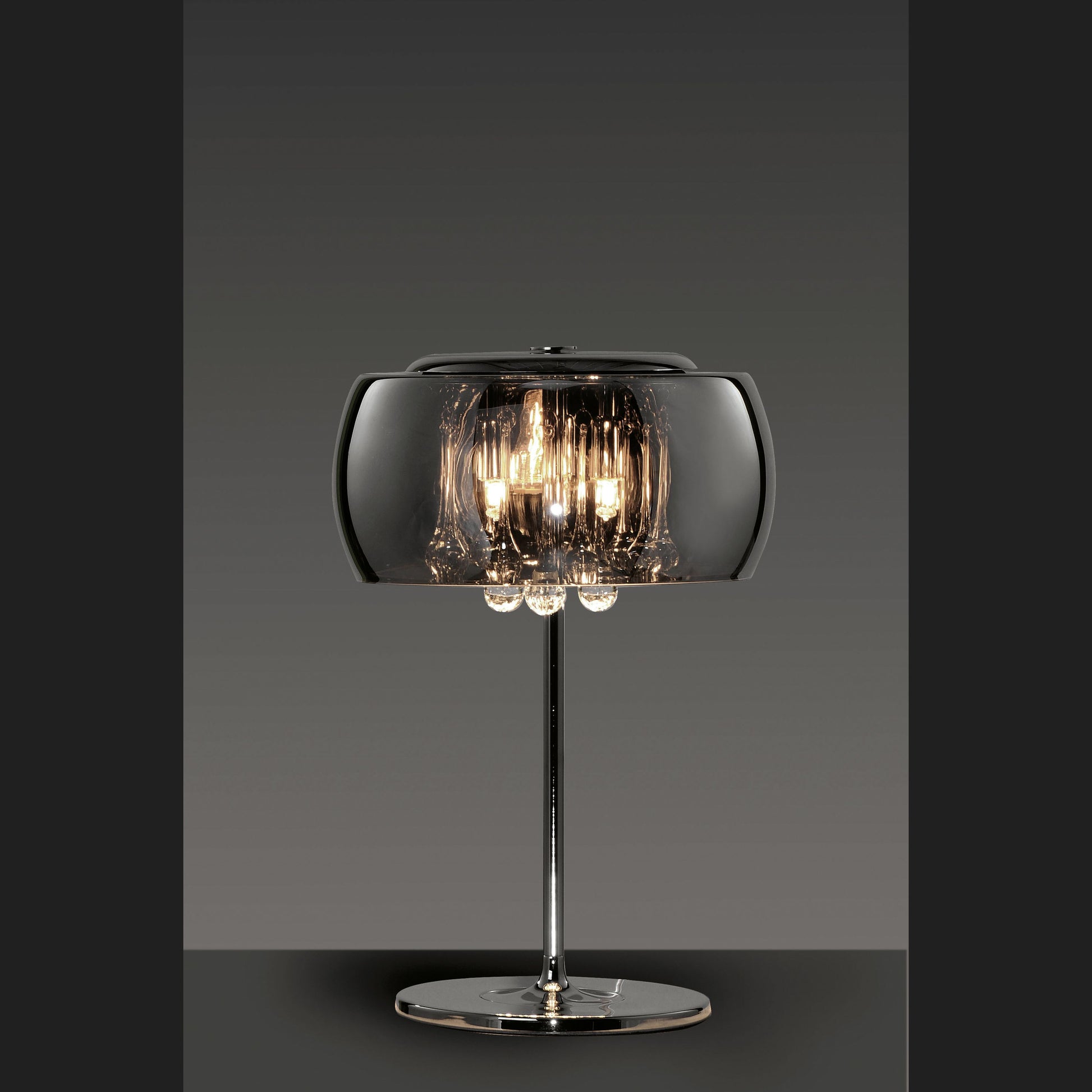 Characteristic luminaires such as those in the VAPORE range lend a room elegance and individual charm. When unlit, the chrome-plated glass shade takes centre stage, but as soon as the VAPORE light is switched on, it shines in new splendour. When illuminated, the otherwise mirrored glass becomes transparent and the integrated glass drops become visible. The contrast of material, colour and playful details makes the lamp unique and gives the room a warm and mysterious atmosphere. The table lamp has a height of 43 cm and a diameter of 28 cm. The three G9 bulbs each emit 624 lumens at 42 watts and a warm white light colour of 2800 Kelvin.