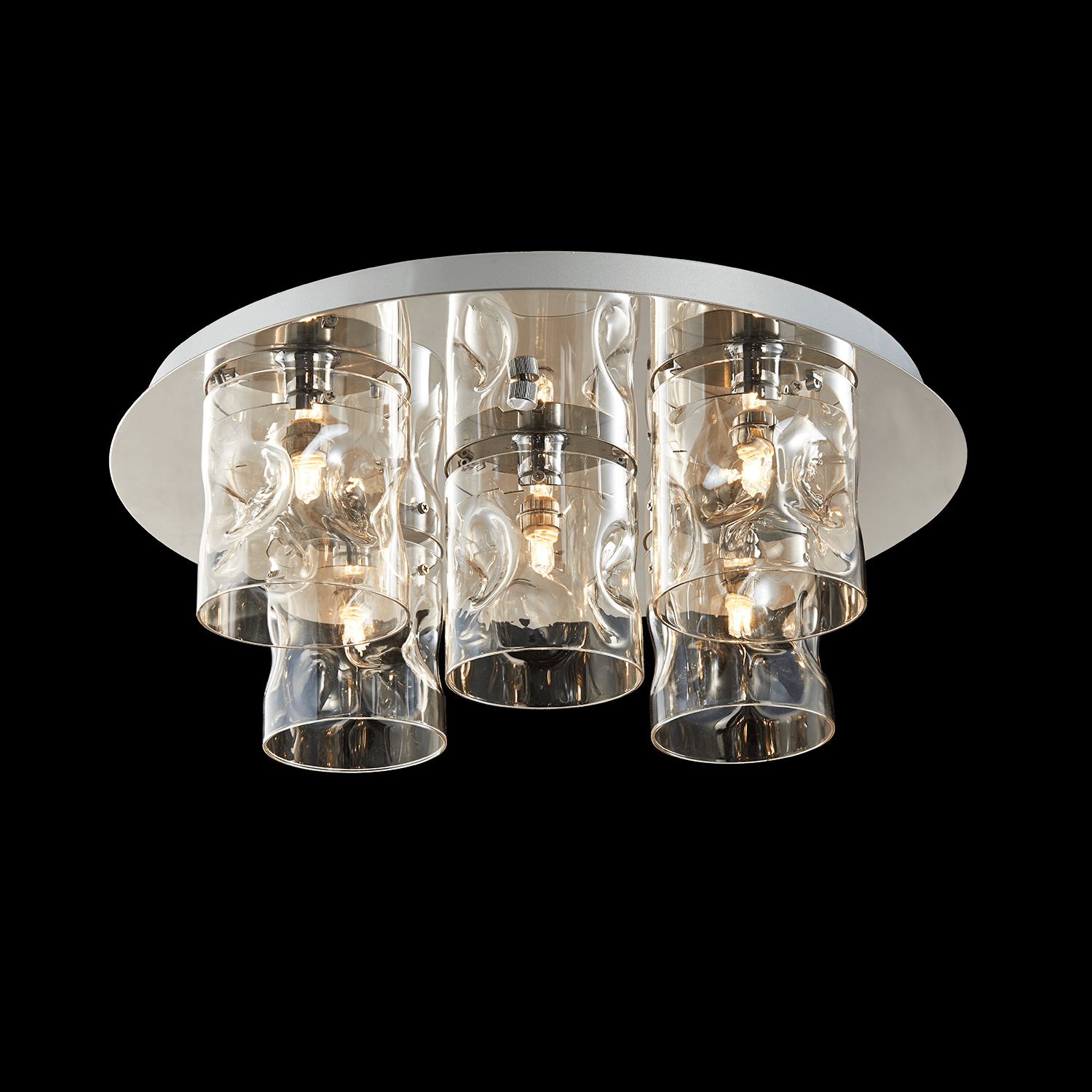 Illuminati Lighting Venus 5 light flush ceiling fitting features a circular ceiling plate in polished chrome finish holding 5 cylindrical shaped translucent champagne glass shade.