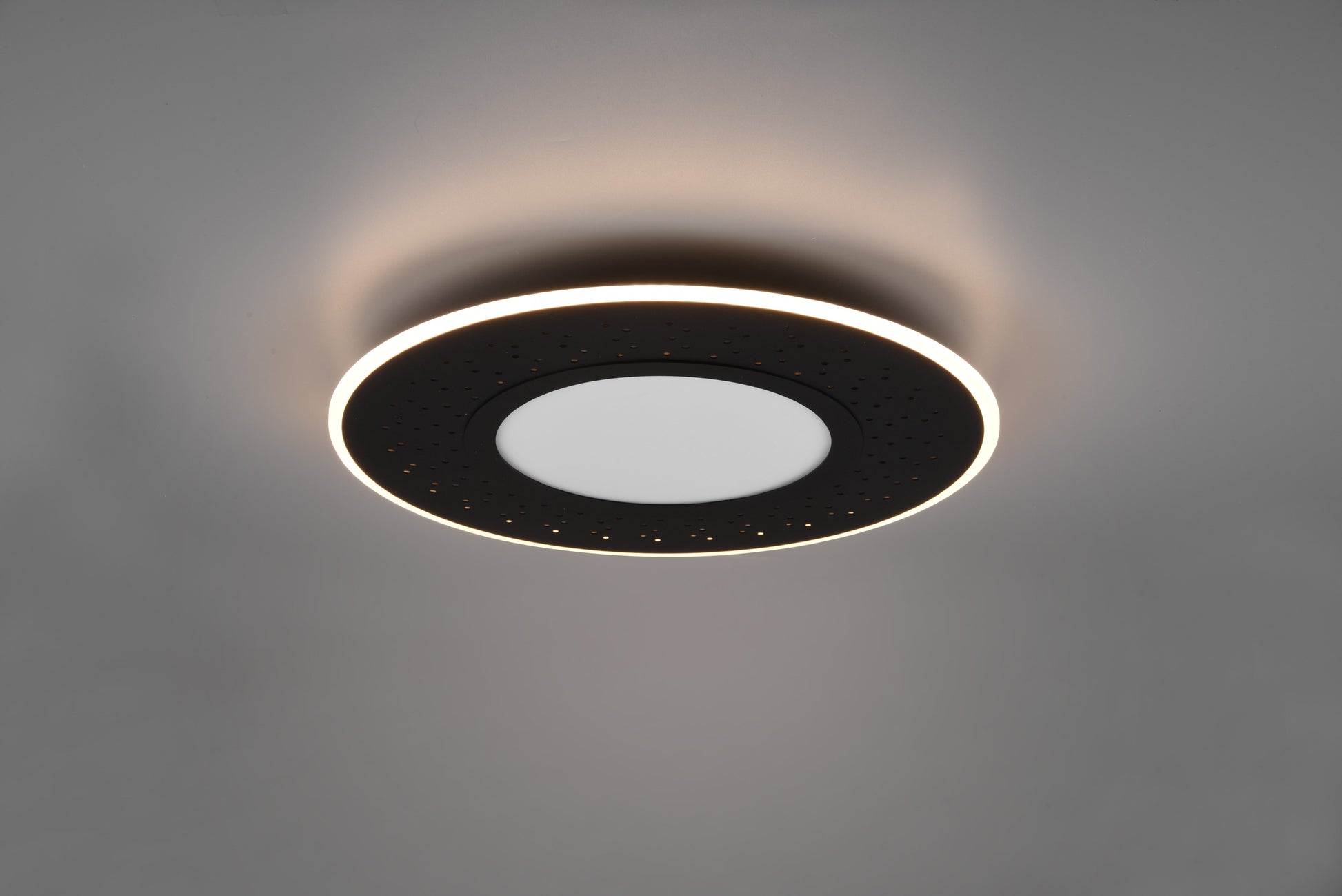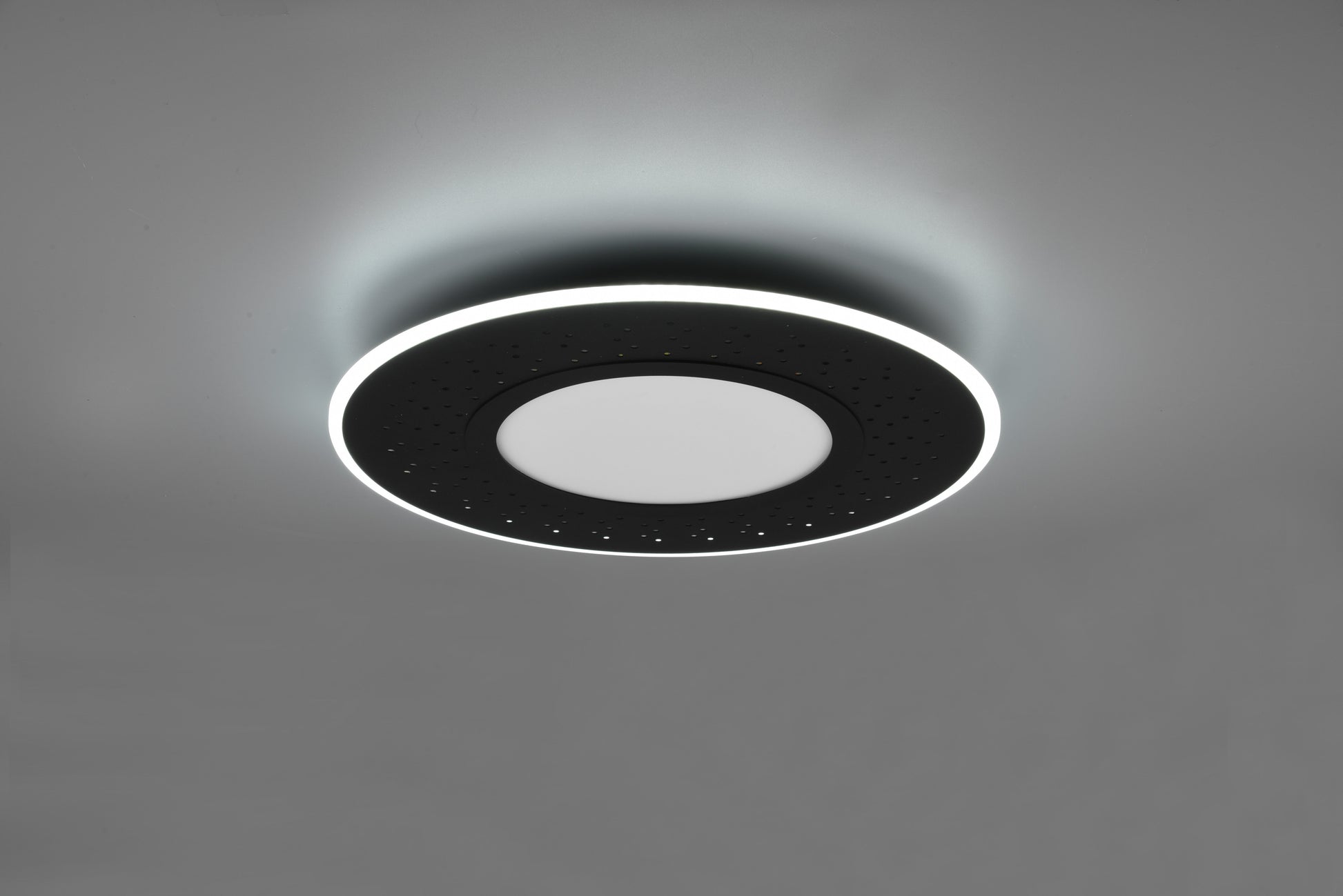 The VERUS ceiling light is a luminous multi-talent. The light points placed in the frame provide a unique lighting experience, and can be switched separately from the main light source. In addition, the brightness can be continuously adjusted via a remote control and a night light function can be selected. With the stylish colour scheme in matt black the lamp can score ideally. It blends easily into any colour scheme and can be combined with other shades. In addition, the luminaire features modern LED technology, which is characterised by high light quality and energy efficiency. Compared to conventional halogen lamps, up to 80% of energy costs can be saved. In addition, LED light sources have a long service life, produce less heat and protect the environment.
