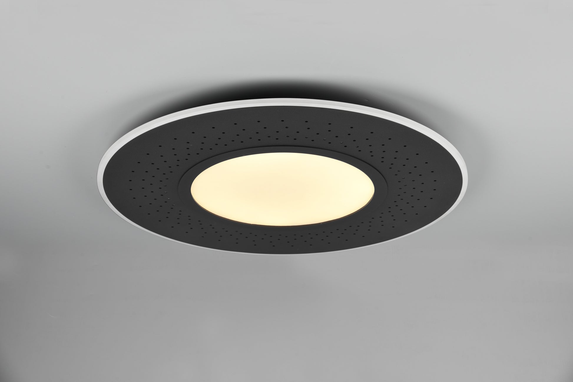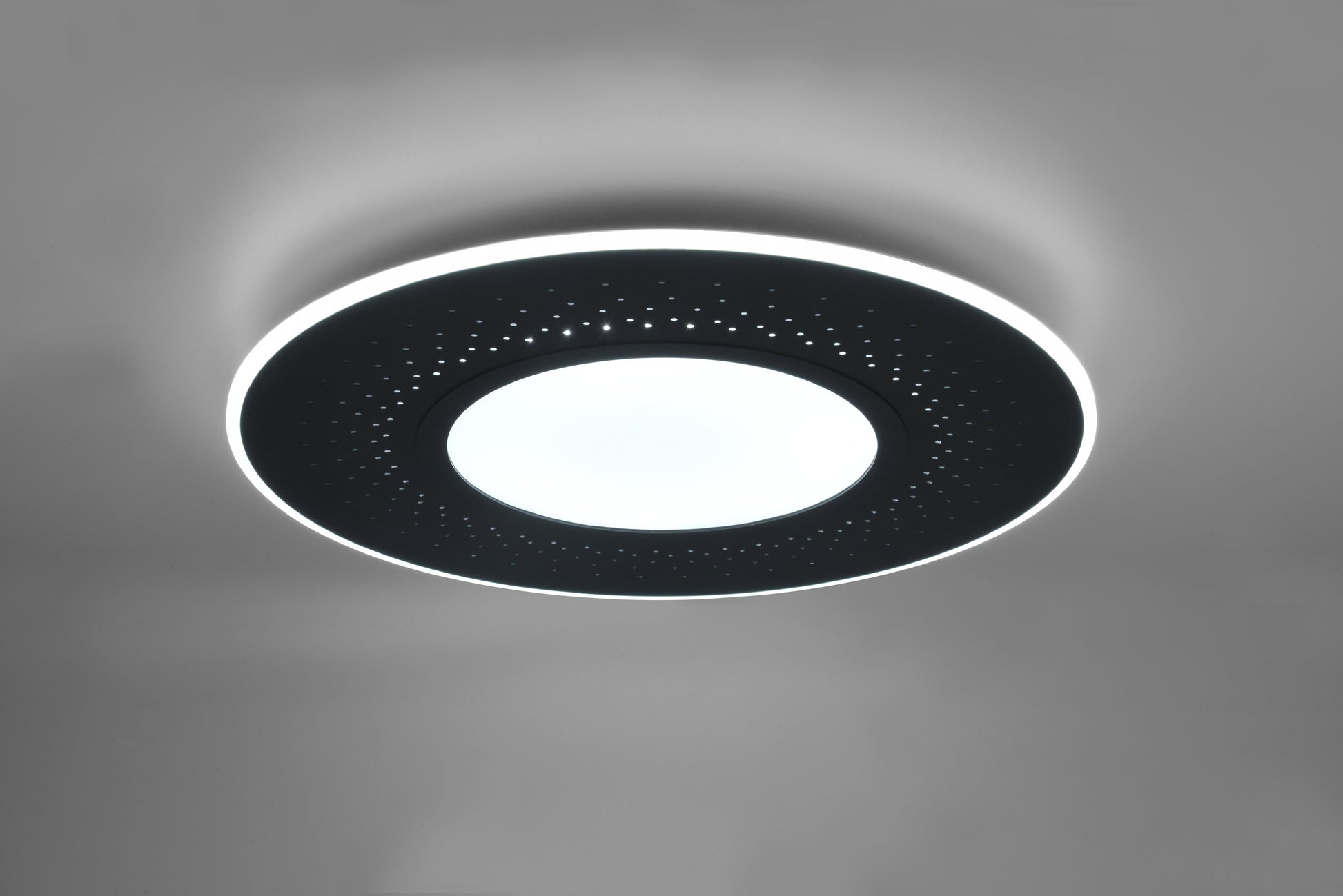 The VERUS ceiling light is a luminous multi-talent. The light points placed in the frame provide a unique lighting experience, and can be switched separately from the main light source. In addition, the brightness can be continuously adjusted via a remote control and a night light function can be selected. With the stylish colour scheme in matt black the lamp can score ideally. It blends easily into any colour scheme and can be combined with other shades. In addition, the luminaire features modern LED technology, which is characterised by high light quality and energy efficiency. Compared to conventional halogen lamps, up to 80% of energy costs can be saved. In addition, LED light sources have a long service life, produce less heat and protect the environment.
