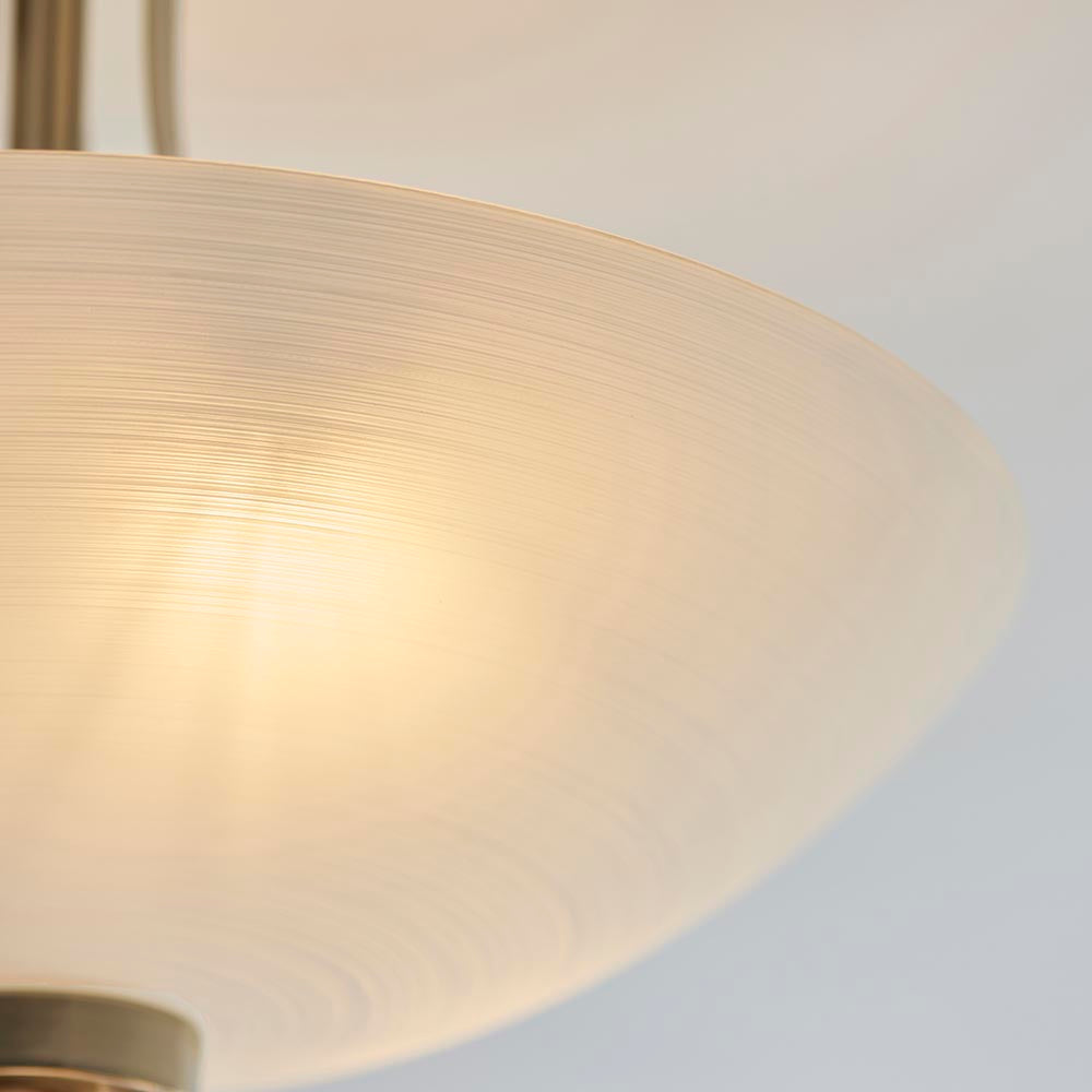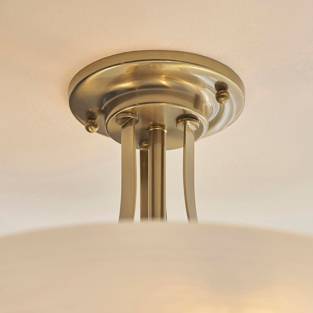 The Welles semi flush light has an antique brass finish complete with a white painted glass shade which has a faint line pattern. Other finishes and matching items are also available, all of which are suitable for use with LED lamps and are dimmable