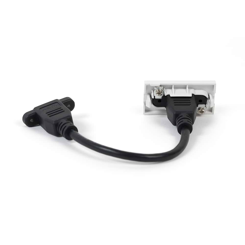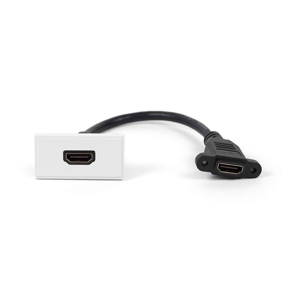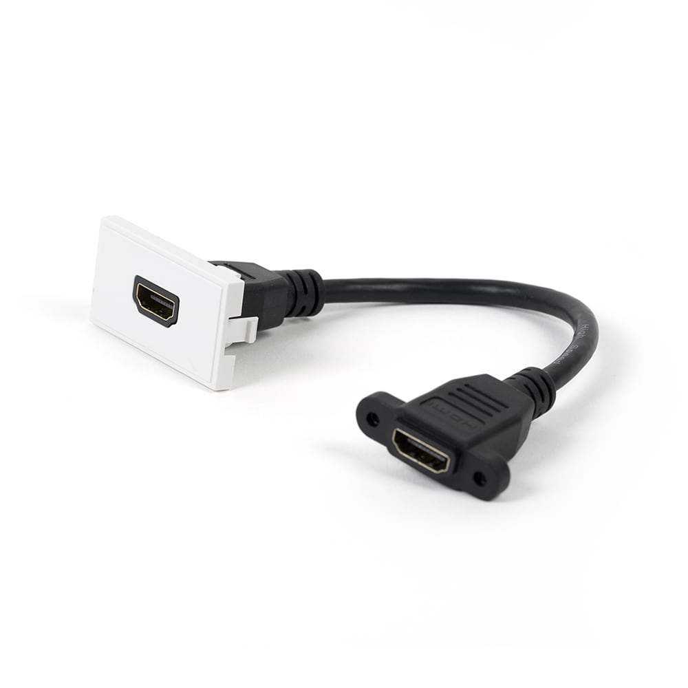 Our 25mm x 50mm high-speed ethernet HDMI connection Euro Module insert with tail is available with black or white front plate. It will support Ethernet 2.0 and has a trailing back cable for HDMI connection which requires a 47mm deep back box. This EM Module is compatible with our Euro Module EM Floor and Wall Plates. This enables you to build bespoke socket or multimedia plates, combining connection outlets such as CAT 5/6, BT, Satellite, USB or HDMI etc. onto a single plate. This EM module is not compatible with RM, CM, (RM+CM), EM, LT1, LT2 or LT3 Plates.