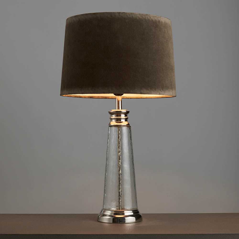 A new colourway for this ever popular and on trend table light. Clear hammered glass, paired with grey velvet shade for a luxurious contemporary take on a classic design.