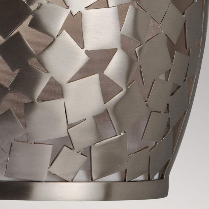 The striking Zara collection is contemporary design with classical curves, creating a truly beautiful range. The mosaic like square metal pieces are individually hand welded together and curved in two directions creating a unique fitting every time. With the addition of the almost translucent Silver Organza shades these Brushed Nickel fittings are completed by the addition of frosted glass diffusers.