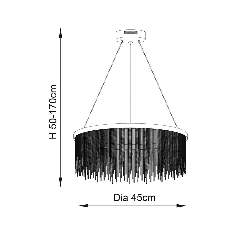 Contemporary LED ceiling pendant with a ring of LED lights diffused by a waterfall of hundreds of delicate chains. Perfect for modern interiors and plated in a polished chrome finish. Seemingly the pendant "floats", suspended from subtle clear cables that are height adjustable.