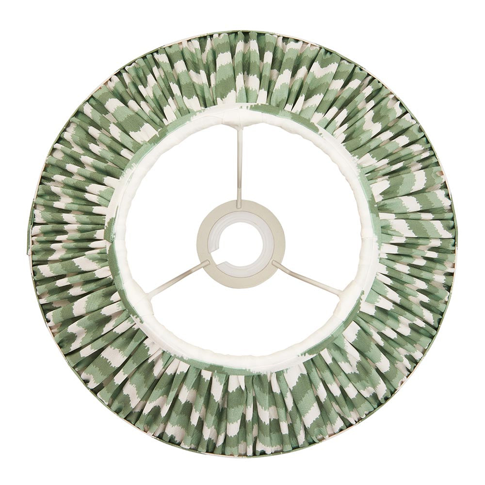 30cm tapered shade with white gimbal. Zigzag pattern in Cotswold green colour with taped edge detailing and plain inner lining.Perfect when paired with one of our beautifully decorative table lights.