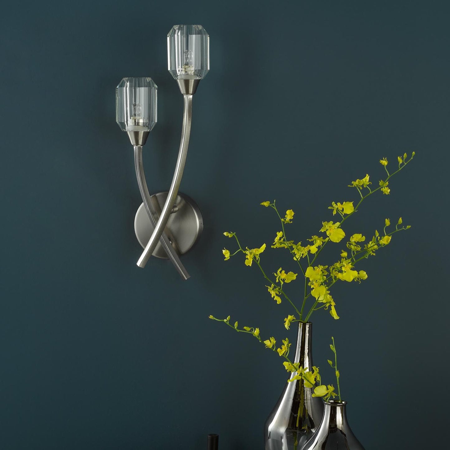 Illuminate your space with the Zonda 2 Light Wall Light from dar lighting. This contemporary satin nickel wall light features sweeping arms that add a touch of drama to any room. The brushed nickel finish provides a sleek, modern look, while the crystal accents add a hint of sparkle and sophistication. Part of the larger Zonda range, this crystal wall light allows you to create a cohesive lighting scheme throughout your home. Whether you're looking to brighten up a hallway, frame a mirror, or add ambient lighting to your living room, this Zonda wall light offers both style and functionality. Its versatile design makes it a perfect fit for modern and transitional interiors alike, adding a contemporary flair to your decor.